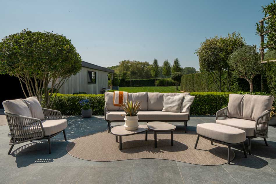 | Korte omschrijving | De Alicante loungeset brengt comfort en stijl naar je tuin of terras. De set bestaat uit een 3-zits bank en twee loungestoelen, elk gemaakt van gecoat aluminium in antraciet kleur en omhuld met handgevlochten rope voor een moderne en luchtige uitstraling. De dikke, weerbestendige kussens bieden een zacht zitcomfort en zijn bestand tegen de weersomstandigheden. Dankzij de duurzame materialen blijft de set jarenlang mooi. Combineer de Alicante loungeset met een van onze op maat gemaakte salontafel en voeg eventueel de bijpassende hocker toe voor een complete, uitnodigende buitenlounge waar je zomerdagen en -avonden in alle rust kunt genieten. |