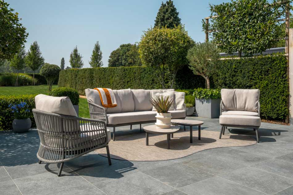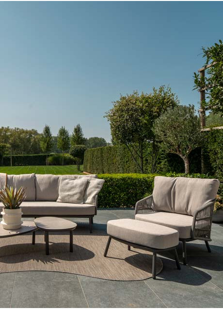 Alicante set anthr. bench organic and 2x living chair De Alicante loungeset brengt comfort en stijl naar je tuin of terras. De set bestaat uit een 3-zits bank en twee loungestoelen, elk gemaakt van gecoat aluminium in antraciet kleur en omhuld met handgevlochten rope voor een moderne en luchtige uitstraling. De dikke, weerbestendige kussens bieden een zacht zitcomfort en zijn bestand tegen de weersomstandigheden. Dankzij de duurzame materialen blijft de set jarenlang mooi. Combineer de Alicante loungeset met een van onze op maat gemaakte salontafel en voeg eventueel de bijpassende hocker toe voor een complete, uitnodigende buitenlounge waar je zomerdagen en -avonden in alle rust kunt genieten. Alicante footstool anthracite with cushion De Alicante Footstool in antraciet biedt extra comfort en maakt je loungeset compleet. Het stevige frame van gecoat aluminium geeft de footstool een luchtige, moderne uitstraling geeft. Het dikke, weerbestendige kussen zorgt voor een zachte ondersteuning van je voeten en nodigt uit om lekker achterover te leunen tijdens warme zomerdagen. Dankzij de duurzame materialen blijft de footstool seizoen na seizoen mooi. De hocker is perfect te combineren met de loungestoelen en bank uit de Alicante collectie, voor een complete en uitnodigende buitenlounge waar je optimaal kunt ontspannen op je terras of in de tuin. |