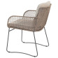 Het zitgedeelte heeft een stevig frame waar het dunne, ronde vlechtwerk met de hand omheen is geweven. Ondanks dat het dunne draden zijn ze zeer sterk en van hoge kwaliteit. Hierdoor zullen ze niet snel scheuren, breken of loslaten. Ook heeft het wicker een hoge UV-bestendigheid waardoor de stoel vrijwel niet verkleurd. De poten zijn gemaakt van RVS en worden voorzien van een poedercoating om ze optimaal te beschermen tegen de weersinvloeden zodat er nauwelijks onderhoud nodig is. Om voor nog meer comfort te zorgen worden standaard een rug- en zitkussen meegeleverd. Deze kussens worden voorzien van een Olefin hoes waardoor ze tevens weerbestendig zijn. Vrijwel iedere kussenhoes is afritsbaar en makkelijk te wassen in de wasmachine op 30°C.