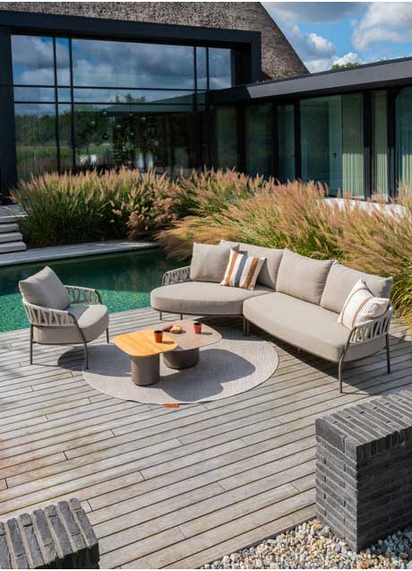 | Korte omschrijving | Deze Calma loungebank met chaise-longue element en Sofie coffeetables is een comfortabele en complete loungeset voor buiten, ideaal voor ontspannen zomerdagen in de tuin of op het terras. Het stevige aluminium frame in terre kleur heeft elegante rondingen en is omhuld met rope in een beige-tint waardoor een elegant kleurcontrast ontstaat. De extra dikke kussens bieden hoog zit- en ligcomfort en maken lange momenten van loungen bijzonder aangenaam. De set wordt aangevuld met Sofie salontafels met afgeronde keramische tafelbladen en een stabiel RVS onderstel in terre kleur, perfect voor drankjes of zomerse hapjes. Dankzij het gebruik van weerbestendige materialen is de loungeset ideaal langdurig buitengebruik. Samen zorgen de loungebank en salontafels voor een sfeervolle, comfortabele buitenplek waar genieten centraal staat. |