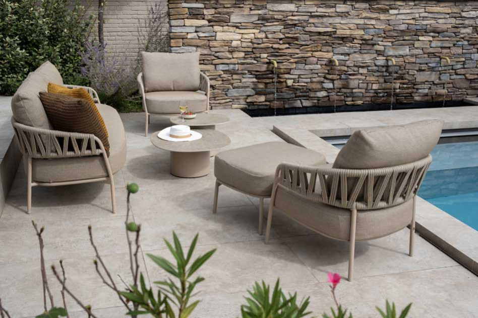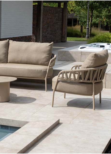 | Korte omschrijving | De Calma latte stoel-bank loungeset is een comfortabele loungeset voor buiten, ontworpen voor ontspannen zomerdagen in de tuin of op het terras. De set bestaat uit een ruime bank en twee bijpassende loungestoelen met elegante ronde vormen en een aluminium frame omhuld met rope, wat zorgt voor een warme en chique uitstraling. De dikke kussens bieden optimaal zitcomfort en maken lange momenten van loungen uitermate aangenaam. Dankzij het gebruik van weerbestendige materialen is deze Calma loungeset geschikt voor langdurig buitengebruik.De lichte latte-kleur versterkt de zomerse sfeer en laat de loungeset moeiteloos aansluiten bij diverse tuinstijlen, ideaal voor wie optimaal wil genieten van het buitenleven. |