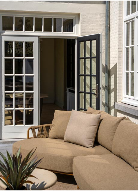 Biarritz chaise lounge right arm amber with 2 cushions and pillow Het Biarritz Chaise-Lounge element met armleuning aan de rechterkant is het perfecte lounge-item om je buitenruimte compleet te maken. Het stevige frame van gepoedercoat aluminium in warme amber kleur is omhuld met zacht rope in elegante beige-bruine kleur, wat eveneens een warme uitstraling geeft. De weerbestendige Olefin kussens zorgen voor ultiem comfort en zijn bestand tegen de weersomstandigheden, ideaal voor langdurig buitengebruik. Combineer dit chaise-lounge element met het Biarritz 2,5-zits loungegedeelte voor een complete loungeset. Voeg één van onze op maat gemaakte salontafels toe voor een stijlvolle, zomerse buitenlounge waar je urenlang kunt ontspannen en genieten van warme dagen. Biarritz 2.5 seater bench left arm amber with 3 cushions De Biarritz 2,5-Seater Bench met armleuning aan de linkerkant is een stijlvol lounge-element voor buiten, ideaal om samen te voegen met het Biarritz chaise-lounge gedeelte voor een complete loungeset. Het stevige gepoedercoate aluminium frame in warme amber kleur is omhuld met elegant gevlochten rope met een warme beige-bruine kleurtint. De weerbestendige kussens bieden een comfortabele zit en zijn bestand tegen de weersomstandigheden, perfect voor langdurig buitengebruik. De ruime zitting en zachte kussens nodigen uit tot ontspannen op zonnige zomerdagen. Combineer dit lounge-element met onze op maat gemaakte salontafels voor een volledige, luxe buitenlounge. Biarritz living chair amber with 2 cushions De Biarritz Living Chair brengt comfort en stijl samen in een modern, zomers design. Het stevige aluminium frame is gepoedercoat in de warme amber kleur en omhuld met rope in diepe warme kleurtinten. De zachte, weerbestendige kussens bieden heerlijk zitcomfort, perfect om te ontspannen in de zon of te genieten van lange zomeravonden buiten. Dankzij de duurzame materialen is deze loungestoel bestand tegen weer en wind, zonder aan uitstraling te verliezen. Combineer de Biarritz Living Chair met één van onze op maat gemaakte salontafels en creëer een luxueuze loungeset voor buiten waar rust en gezelligheid samenkomen. |
