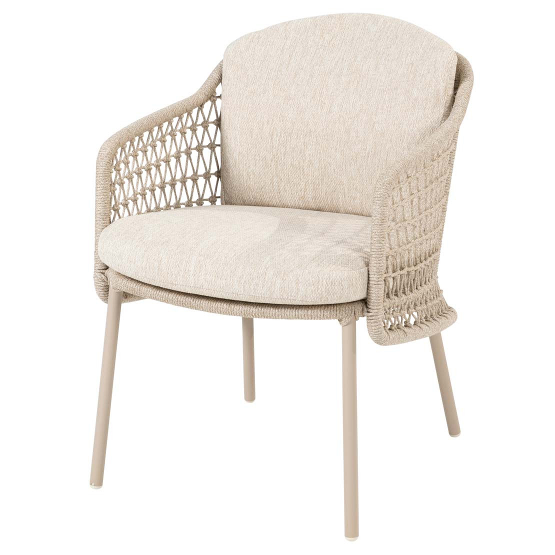 Het zitgedeelte heeft een stevig frame waar het elegante rope omheen is geweven. De ronde draden zijn voorzien van een kunststof kern welke wordt omhult door een acryl stof vergelijkbaar met de weerbestendige tuinkussens. Hierdoor voelt het rope zacht aan en is het toch weerbestendig, Uv-bestendig en zeer kleurvast. De poten zijn gemaakt van RVS in 304 kwaliteit. Deze poten worden vervolgens voorzien van een poedercoating om ze optimaal te beschermen tegen de weersinvloeden zodat er nauwelijks onderhoud nodig is. Om voor nog meer comfort te zorgen worden standaard een rug- en zitkussen meegeleverd. Deze kussens worden voorzien van een Olefin hoes waardoor ze tevens weerbestendig zijn. Vrijwel iedere kussenhoes is afritsbaar en makkelijk te wassen in de wasmachine op 30°C.