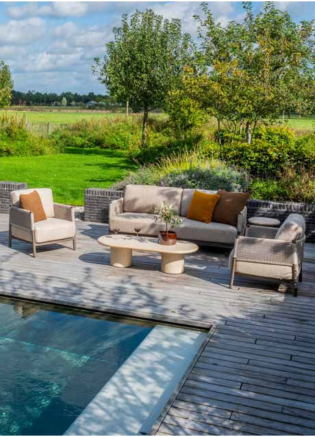 | Wat is Olefin? | 4 Seasons Outdoor tuinmeubelen worden gemaakt om het hele jaar door van te kunnen genieten. Dat merk je bijvoorbeeld aan het geweldige comfort van onze tuinsets en loungesets, maar dat merk je ook als je geen gebruik maakt van je tuinmeubels. De kussens in alle 4SO tuinmeubelen zijn namelijk weerbestendig, zodat je ze gewoon in je tuin set kunt laten liggen. Onze tuinkussens zijn altijd bij onze tuinmeubelen inbegrepen. 4 Seasons Outdoor kussens voelen comfortabel aan, bijna zoals de bank of de stoelen die binnen staan. Dat komt omdat bijna al onze kussens een kussenhoes hebben van ‘Olefin’ stof. Deze stof heeft allerlei unieke eigenschappen. De grondstof voor het maken van olefin is olie. Daar wordt al in een vroeg stadium de kleurstof aan toegevoegd zodat deze in de kern aanwezig is. Dat maakt de stof zo kleurvast, Uv-bestendig en waterafstotend. Zo wordt Olefin bijvoorbeeld ook gebruikt voor technische sportkleding en in de auto-industrie. |